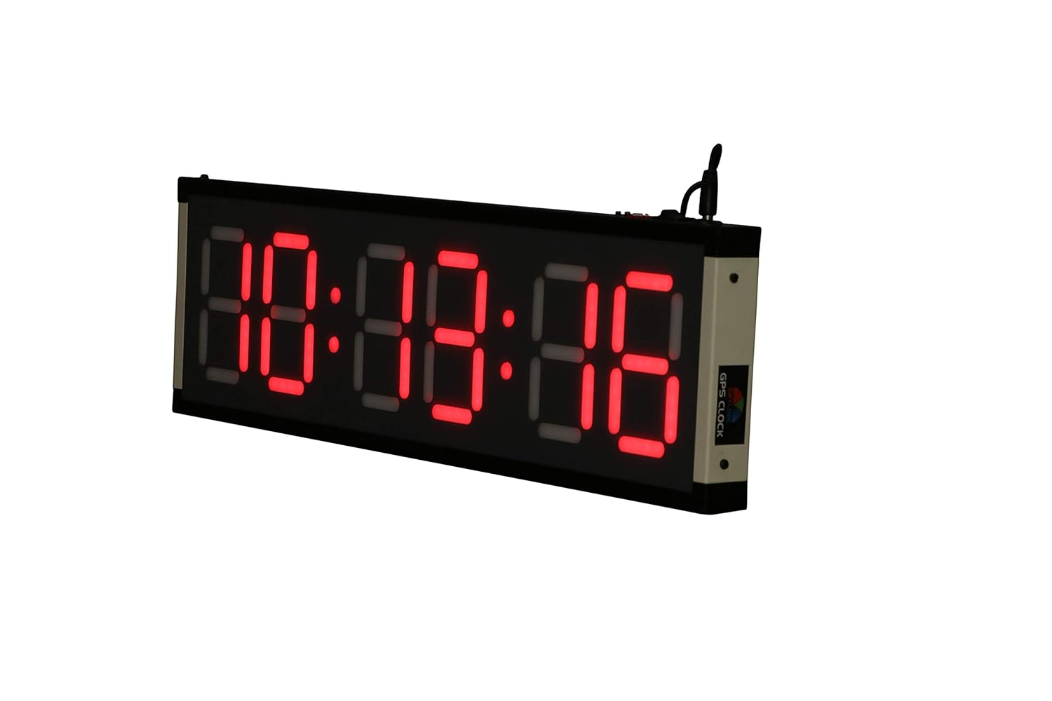 JUMBO Large LED GPS wall clock 6 digit (HH:MM:SS) Time format, GPS Controlled, Local Time/GMT, Brightness High/ Low and 12/24 Hours Mode selectable, PVC-MS Housing, Operating Voltage: 110-230v, 50-60 Hz AC.